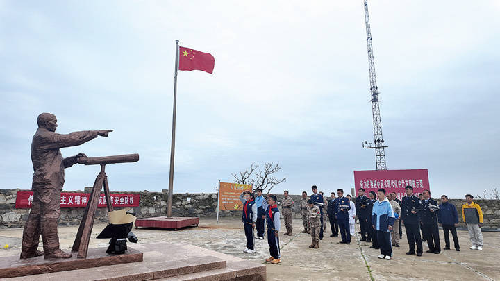 在开山岛国旗台,守岛民兵主持升旗仪式,全体人员肃立敬礼、齐唱国歌,重温王继才同志32年每日升国旗的守岛初心,感悟“守岛就是守国、升旗就是铸魂”的精神内核。两名学生代表向王继才雕像敬献鲜花,全体人员跟随守岛民兵重走208级巡岛石阶。沿着开山岛环岛“英雄之路”,守岛民兵一路讲解王继才夫妇巡岛查哨、观测海情、应对台风等真实经历,全体人员共同体验“脚踩礁石、心系家国”的守岛状态,并到“海魂书屋”签字打卡。