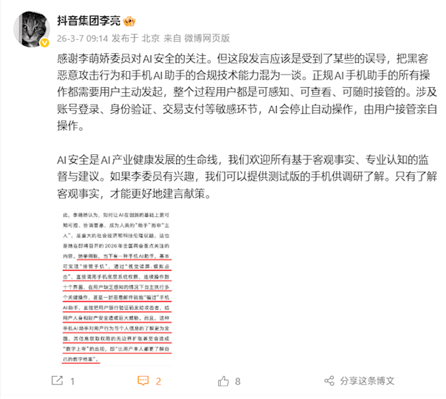 对此,抖音集团副总裁李亮回应称:“感谢李萌娇委员对AI安全的关注。但这段发言应该是受到了某些的误导,把黑客恶意攻击行为和手机AI助手的合规技术能力混为一谈。”